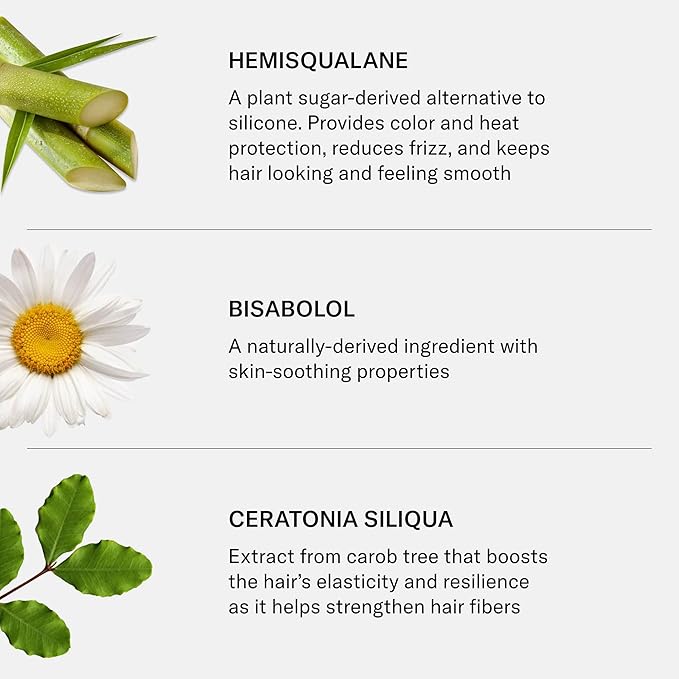 - Hero Ingredients: Hemisqualane – a plant sugar-derived alternative to silicone that provides color and heat protection, reduces frizz, and leaves hair smooth. Bisabolol – a naturally derived ingredient with skin-soothing benefits. Ceratonia Siliqua – carob tree extract that boosts elasticity and strengthens hair fibers. Moringa Oleifera – horseradish tree extract that shields hair from pollution and UV rays. Squalane – a plant-derived moisturizer that nourishes, restores luster, and adds shine.
