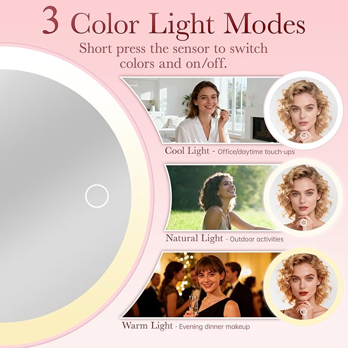 - 3 COLOR LIGHT AND STEPLESS BRIGHTNESS: Pink vanity mirror with lights offers warm, natural, and cool lighting with stepless brightness adjustment. Short press the touch button to switch colors or long press to adjust brightness, so you can customize the perfect lighting for flawless makeup.